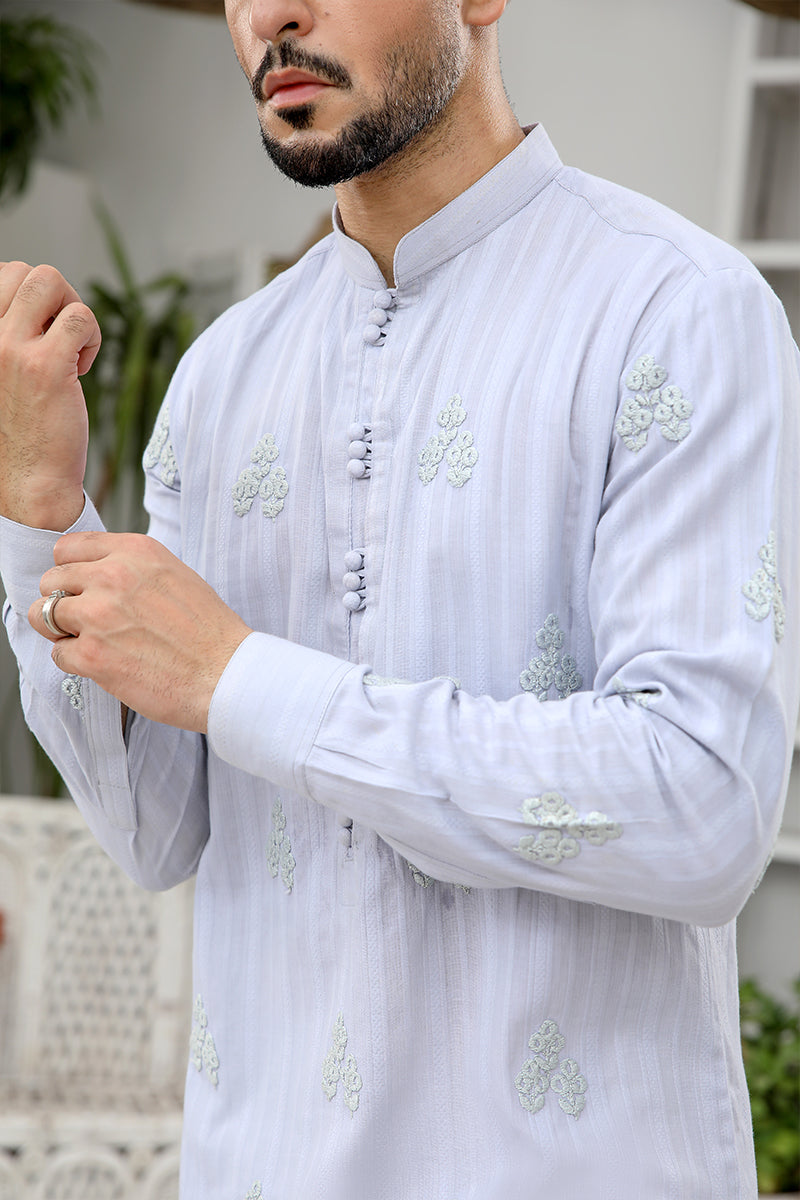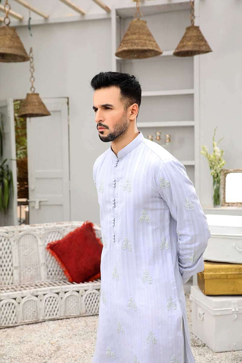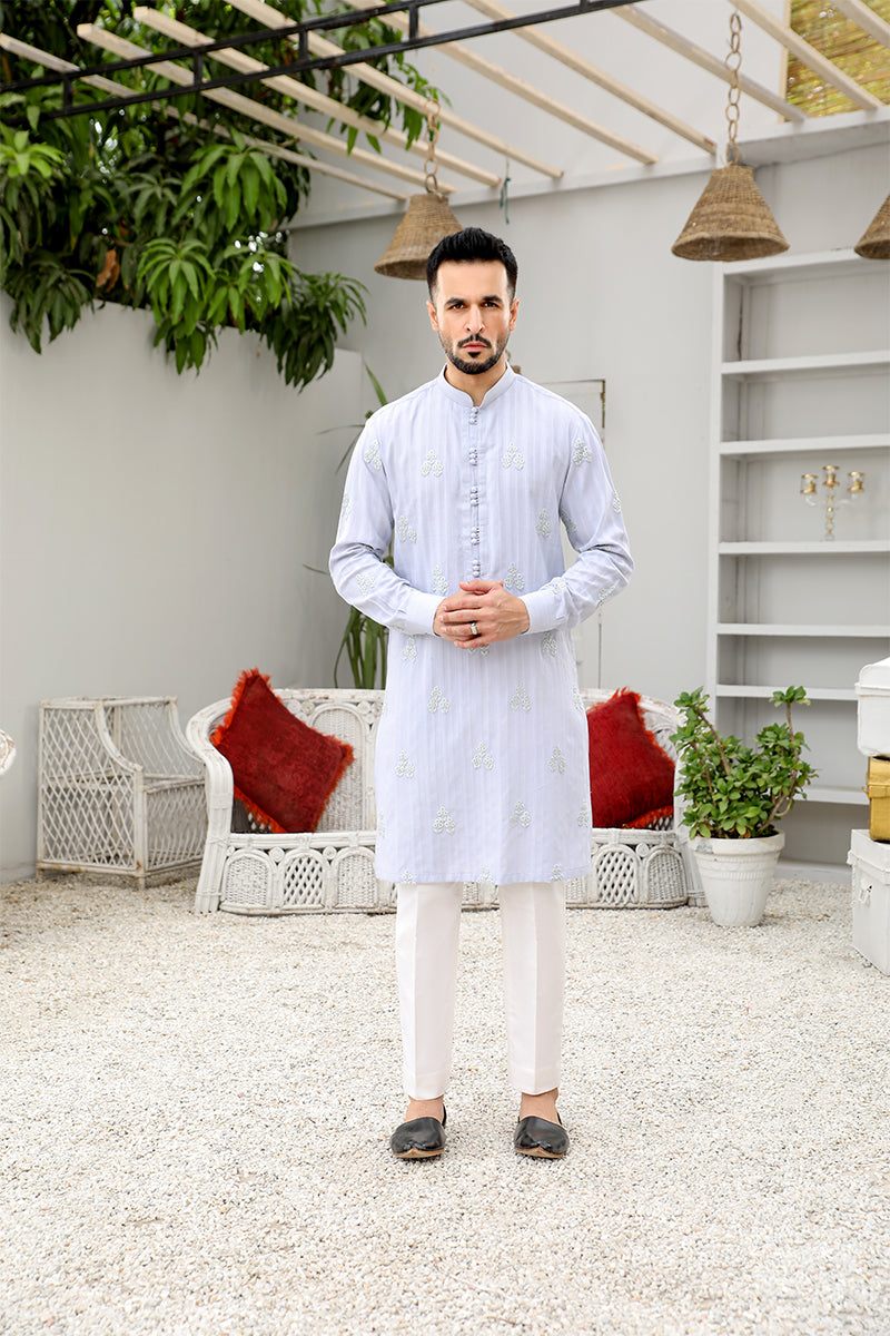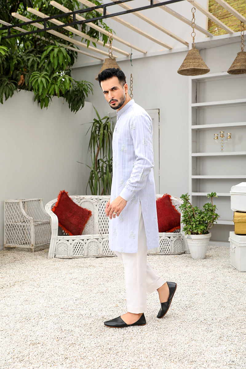 Ice blue textured lawn kurta features; loop button neckline, collar, cuff sleeves, and front embroidered spray motifs, paired with white cotton trouser to complete the look.