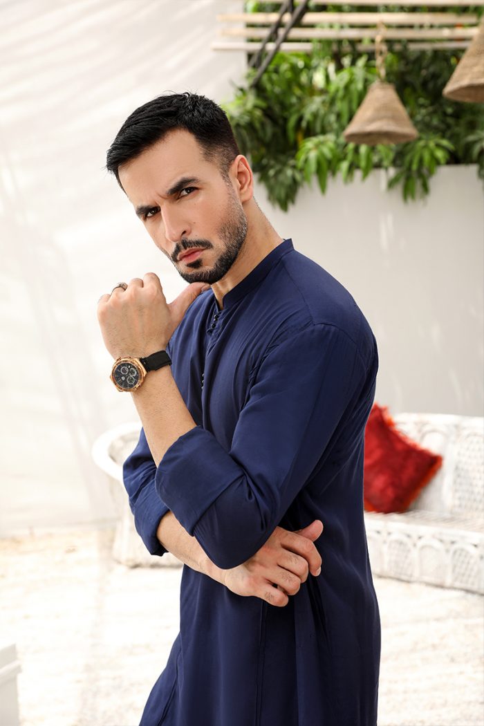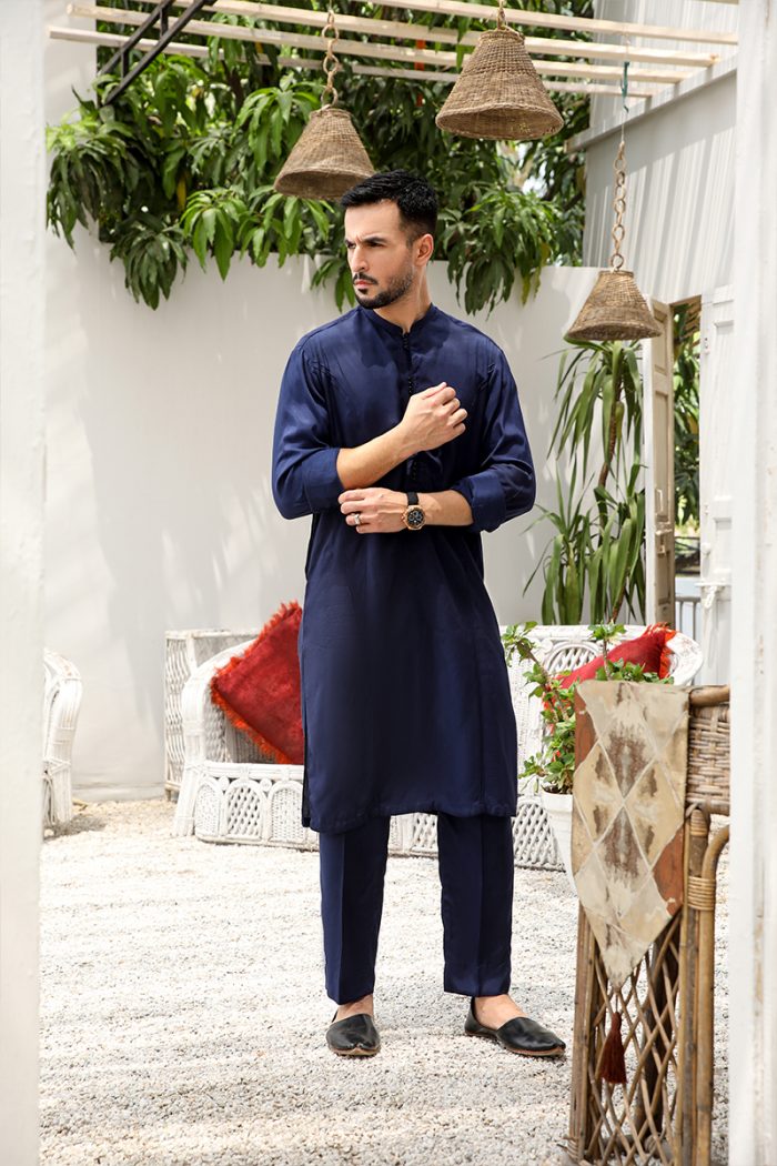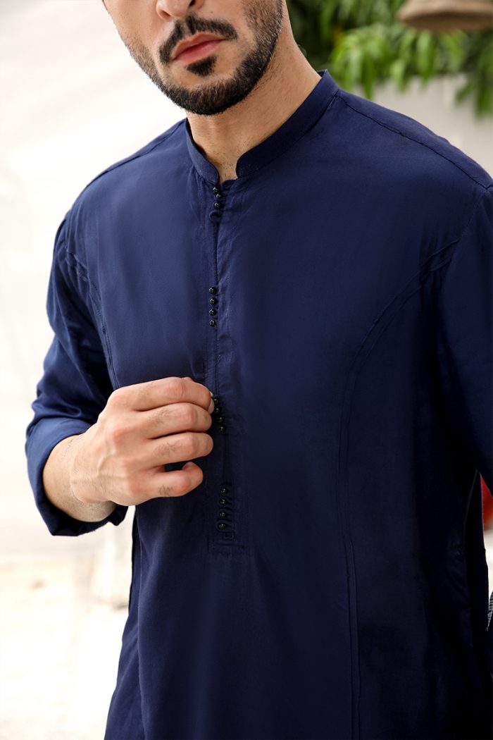 Midnight Blue is a classic matching kurta and pants that features: double cuffs, Loop buttons, and pintex detail on the front.