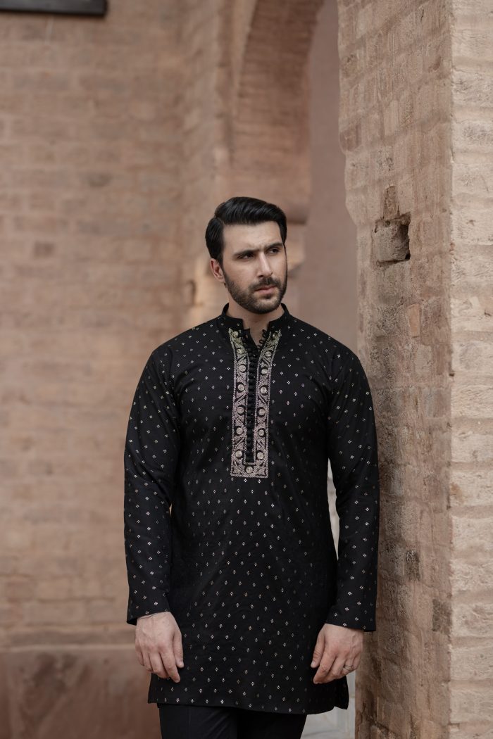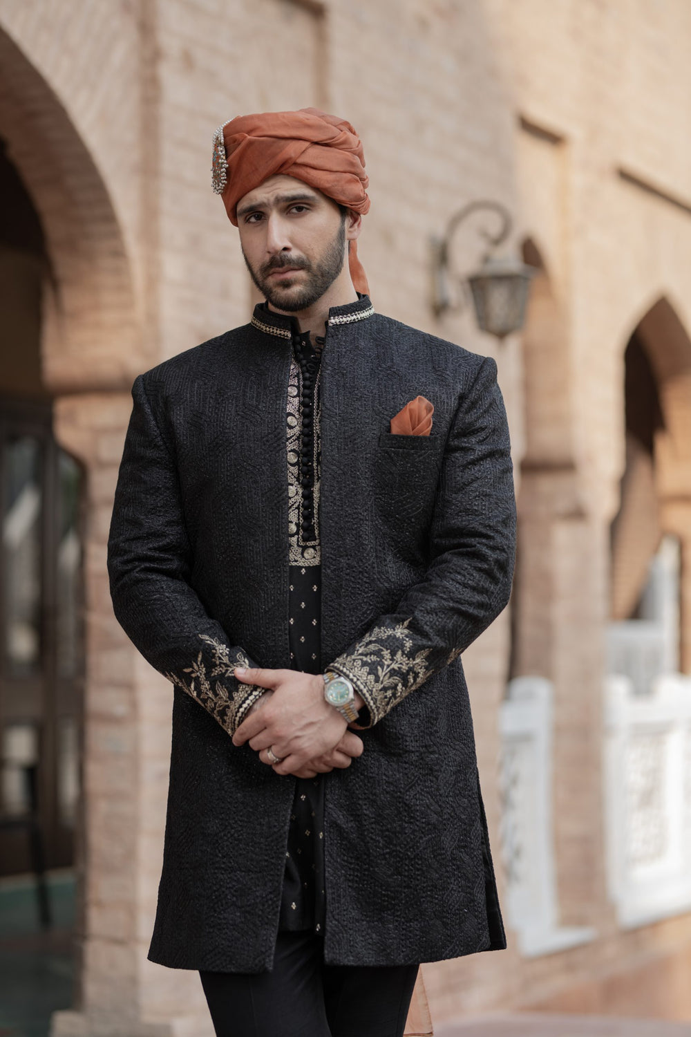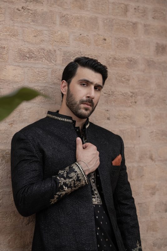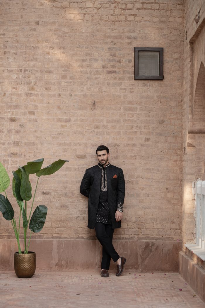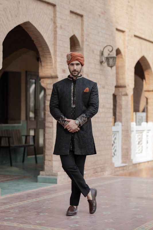 Black is a must have open sherwani. It has embroidered sleeves and collar paired with Banasri kurta with a unique antique Dori work on neckline, same color trouser completes the elegant look. Further it is paired with rust accent pocket square and with qulla.