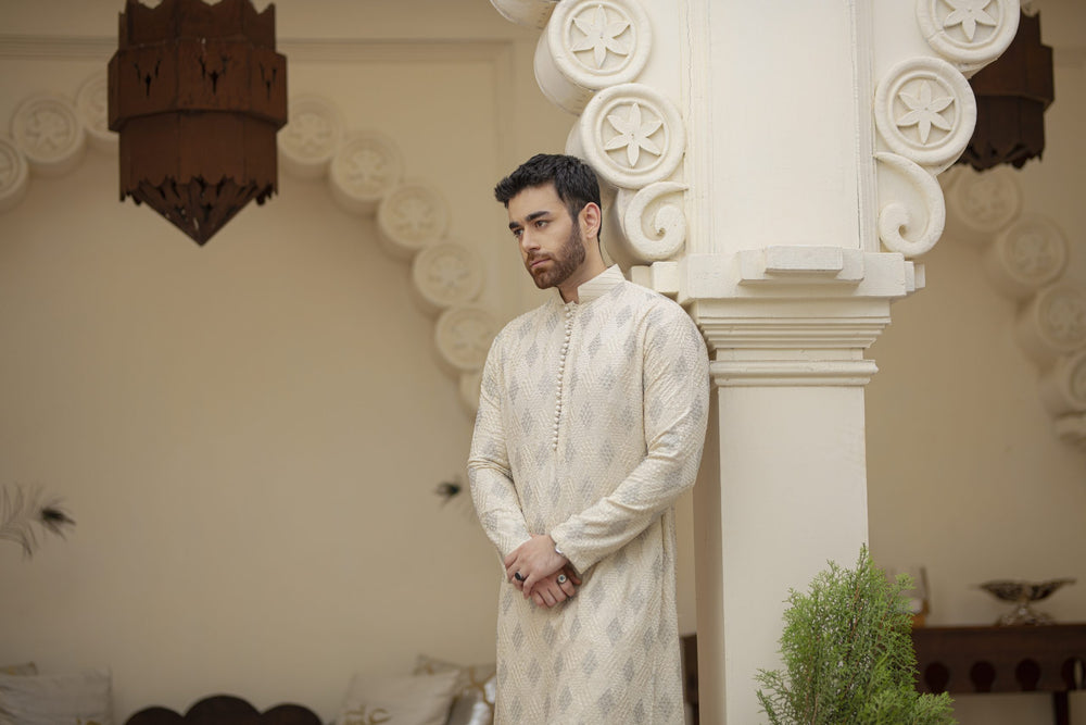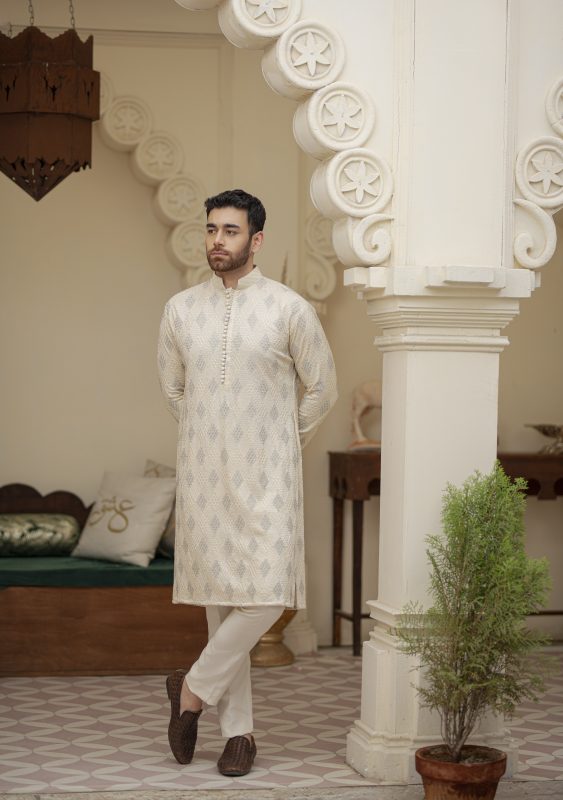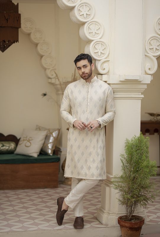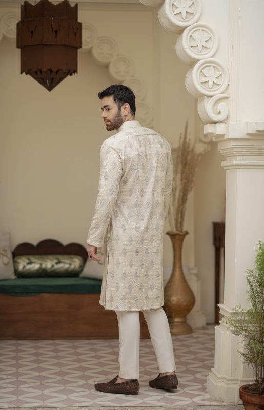 Embroidered Raw silk kurta is an exclusive festive wear feature; Front, Back & sleeves fully embroidered, paired with ivory trousers to complete the look.