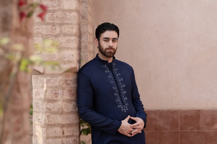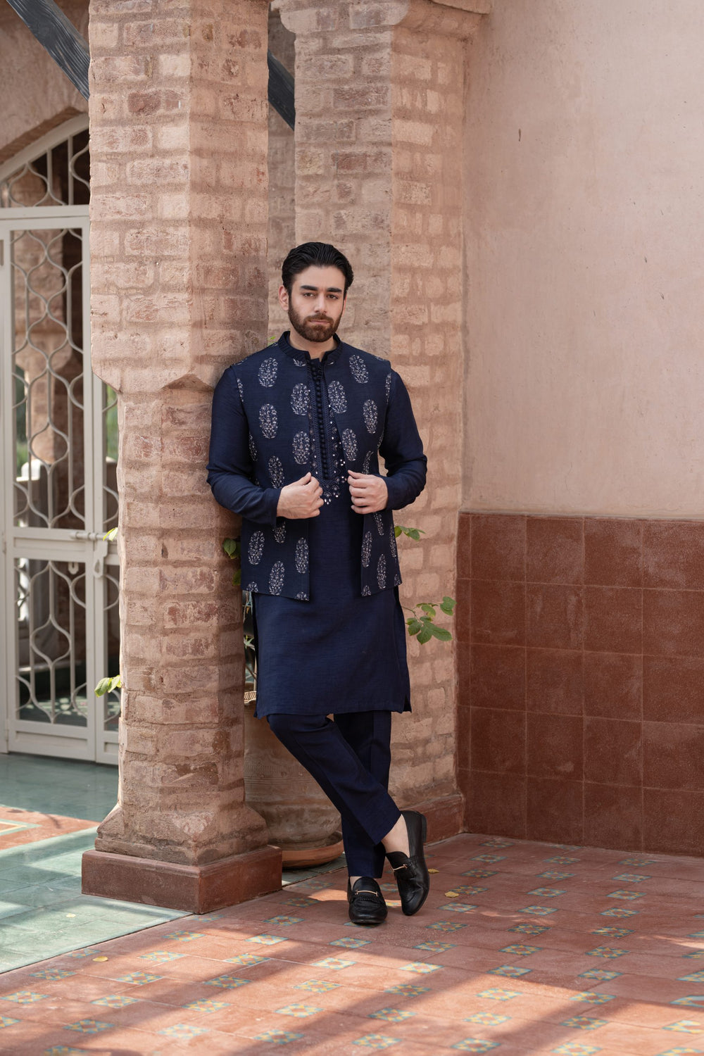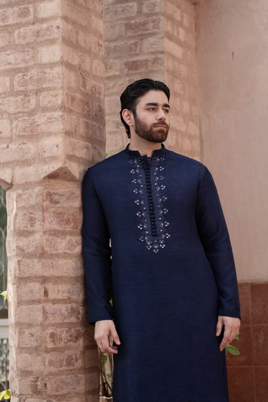 Midnight Blue waistcoat is embroidered with all over statement motifs paired with same color kurta and Trouser. Furthermore delicate mirror work is embroidered on kurta elevates the traditional classic look.