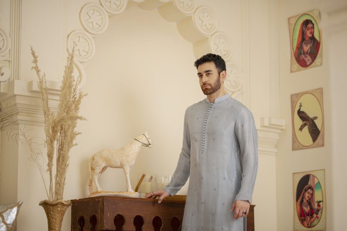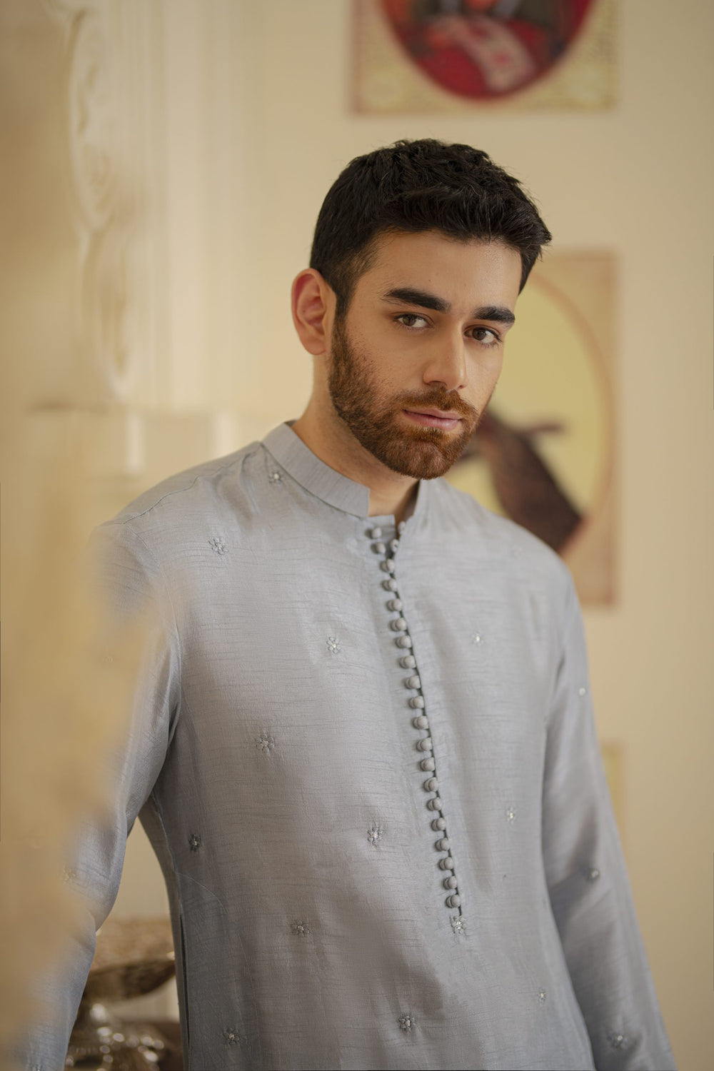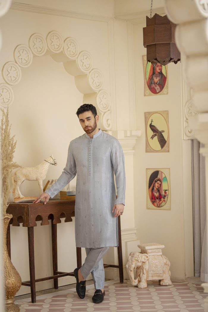 All over embroidered buti spray with the hint of silver badla on the Raw silk canvas is an exclusive festive wear features; Front & Sleeves embroidered, paired with trouser to complete the look.