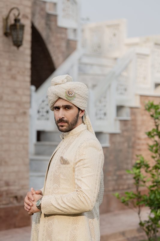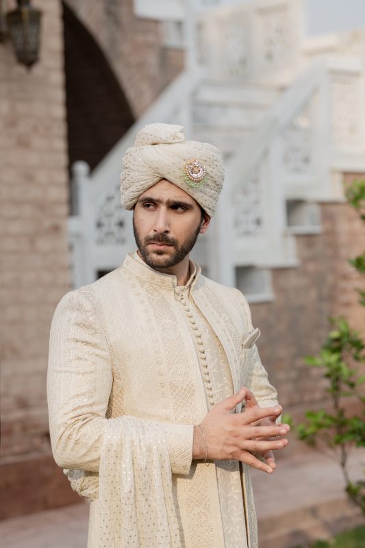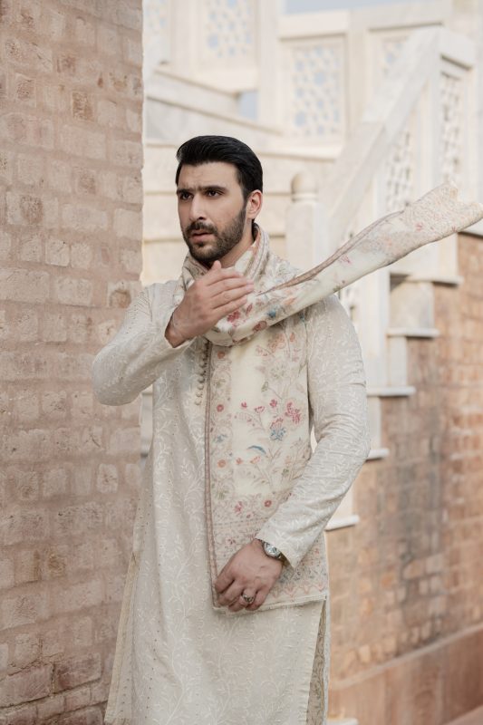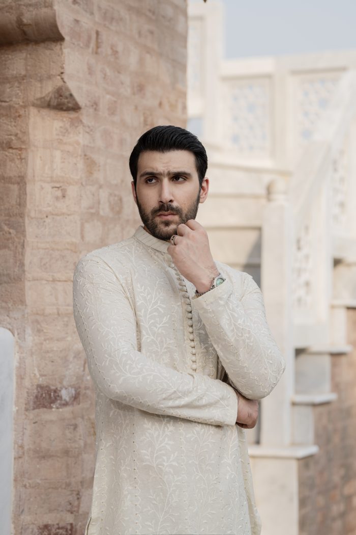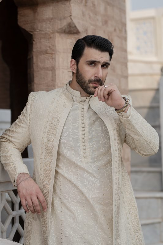 Embroidered Ivory kurta with open sherwani is an exclusive festive wear feature; highlighted tilla on kurta and with gold sequin in partition all over on sherwani paired with ivory trousers to complete the look. It is timeless classic ivory look that can be worn at any event or occasions.