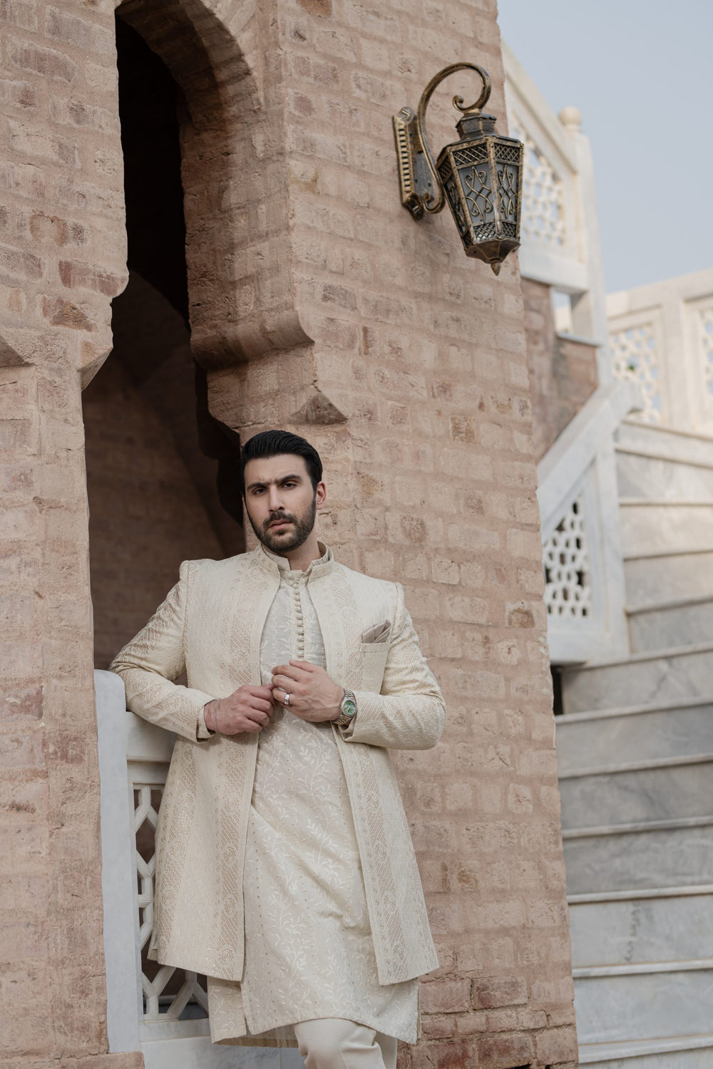 Front-Open Sherwani: Embroidered Cotton Karandi