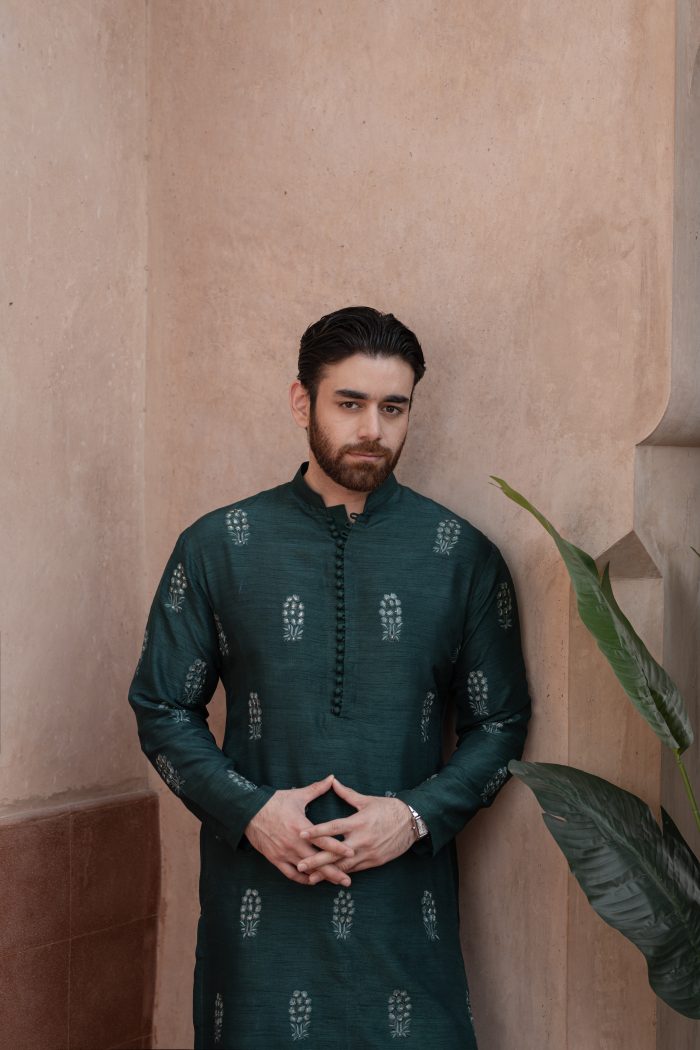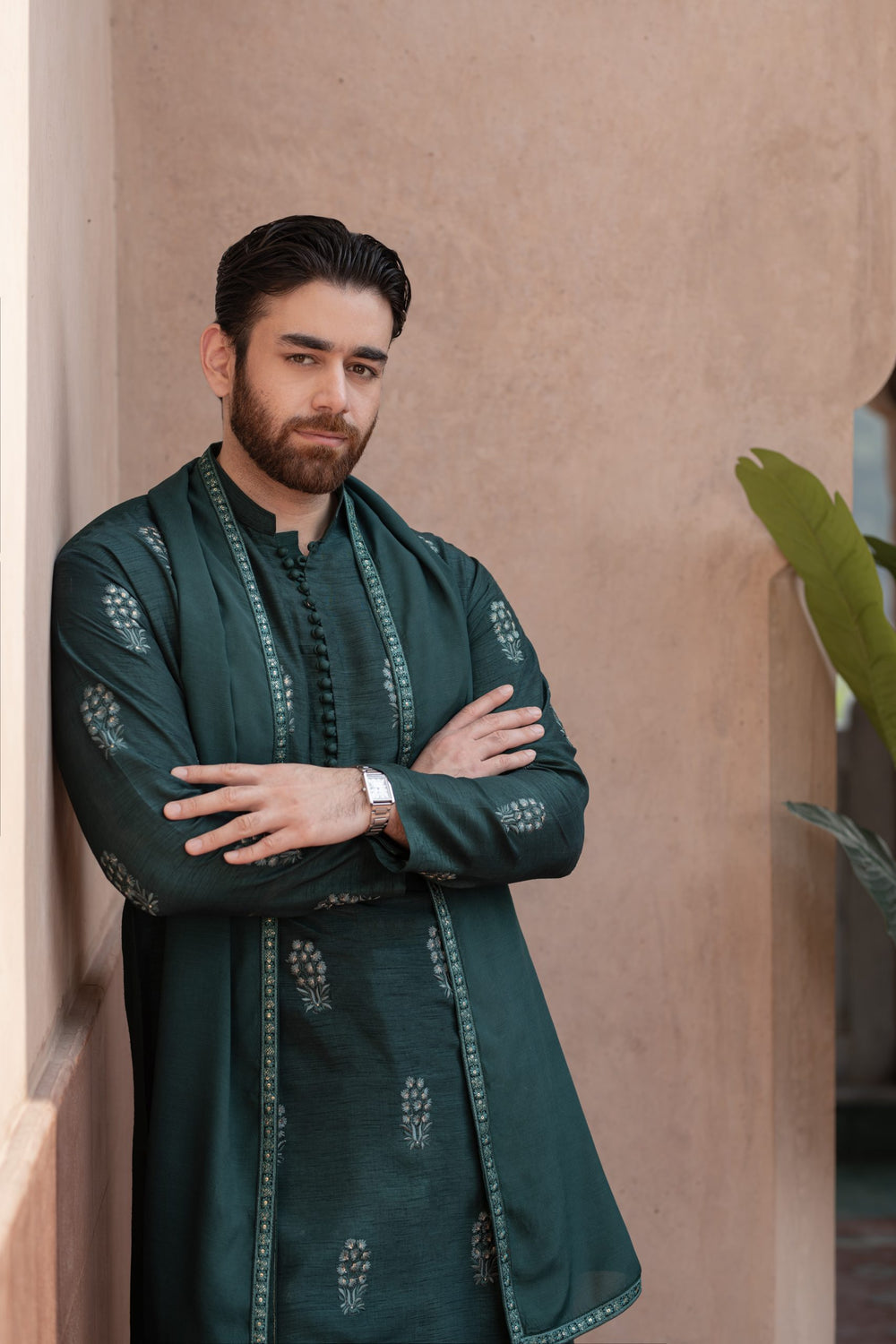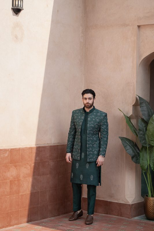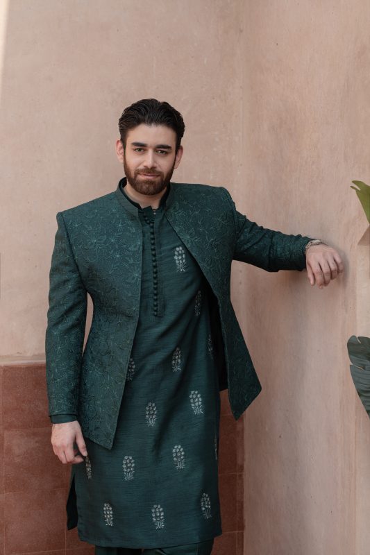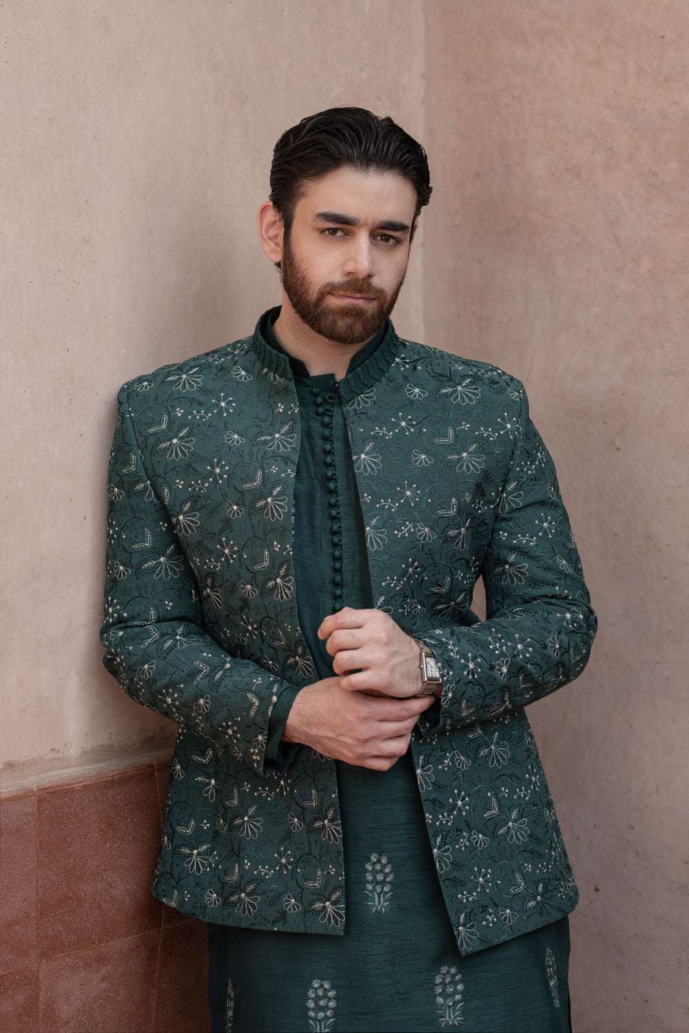 Emerald green jacket is fully embroidered with floral jaal all over highlighted with gold tilla. Further jacket is paired with same color kurta and toruser. Kurta is hand emboridered with statement motif all over on front and on sleeves.