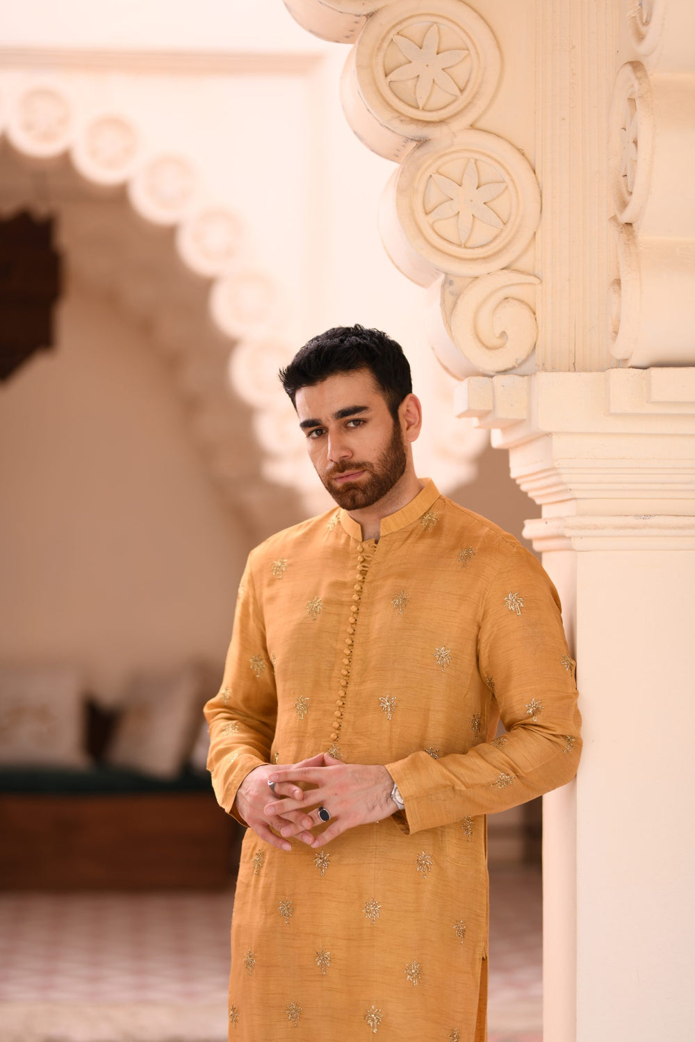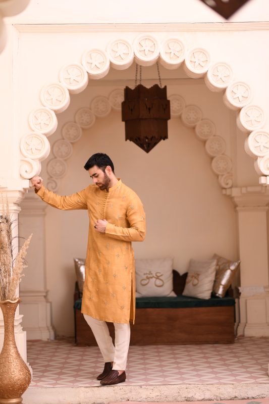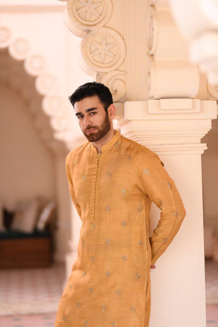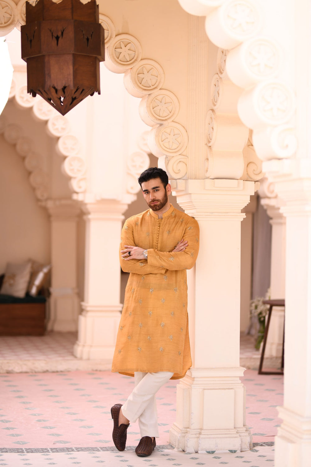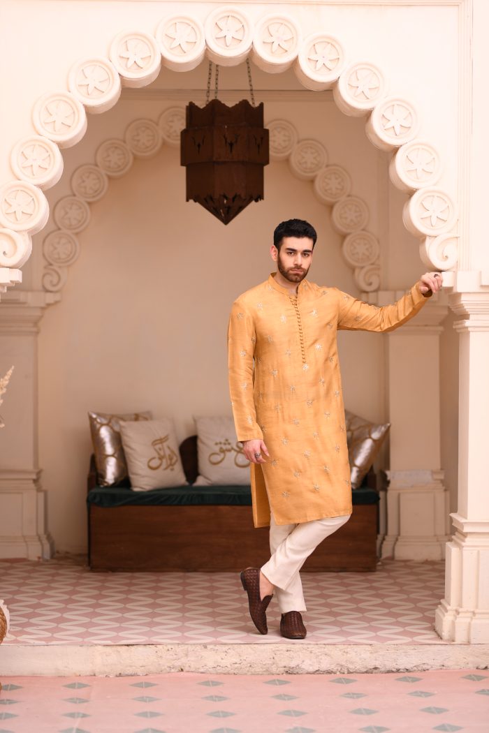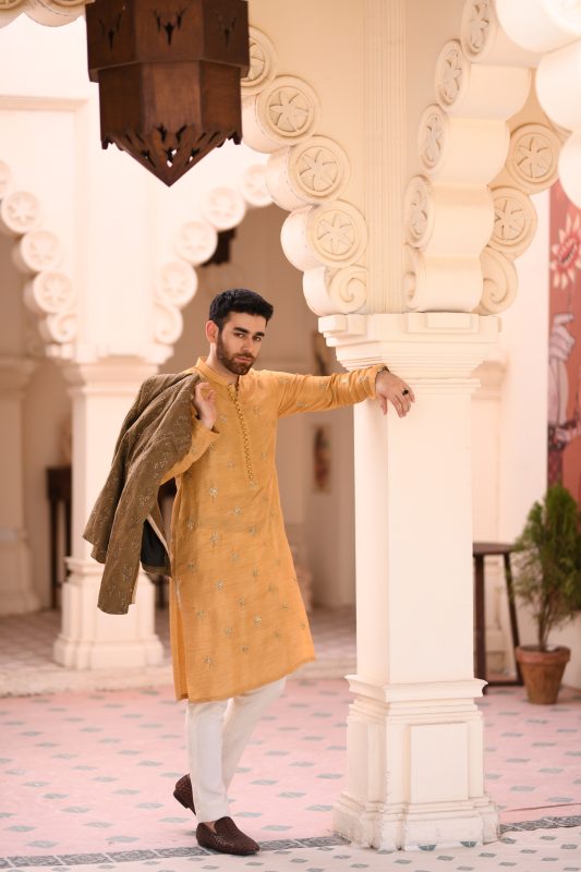 Embroidered Raw silk kurta is an exclusive festive wear features; Front & Sleeves embroidered with badla work, paired with ivory trousers to complete the classic look.